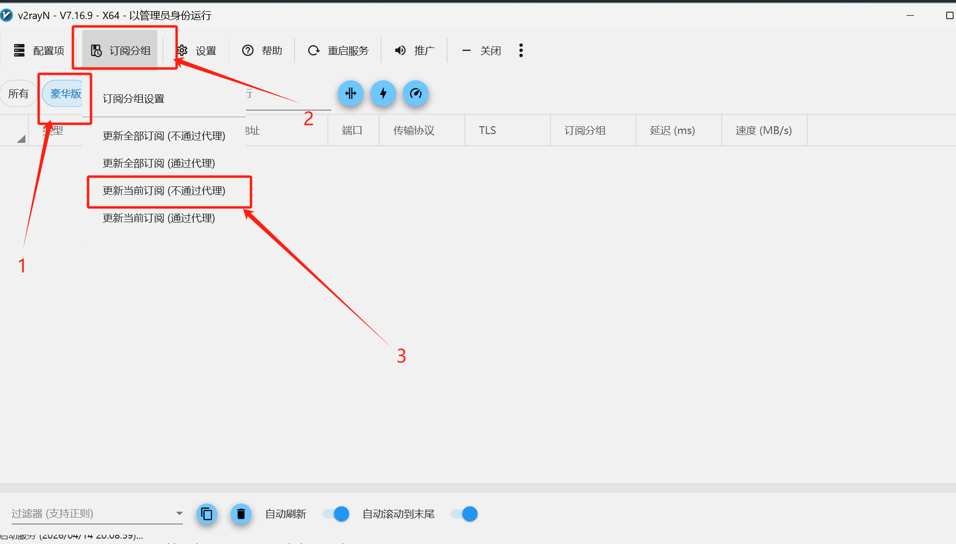 添加完成后,点击更新全部订阅,等待节点列表加载出来。