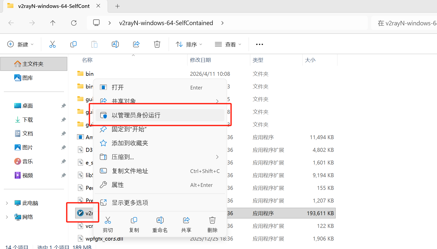 找到主程序 v2rayN.exe,鼠标右键选择以管理员身份运行。程序启动后一般会缩小到右下角托盘,或者双击蓝色 V 图标即可打开主界面。