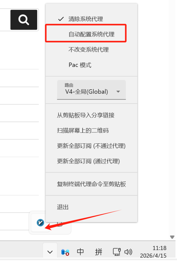 然后到屏幕右下角托盘找到蓝色 V 图标,鼠标右键打开菜单,选择自动配置系统代理,即可开始使用。